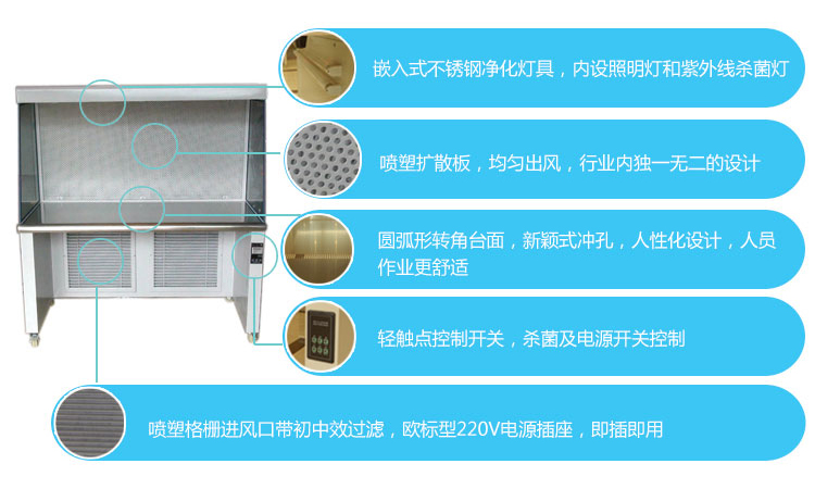 箱體1.2mm軋鋼板烤漆,臺(tái)面SUS304 1.2mm厚度不銹鋼(可訂做全不銹鋼超凈臺(tái)) |